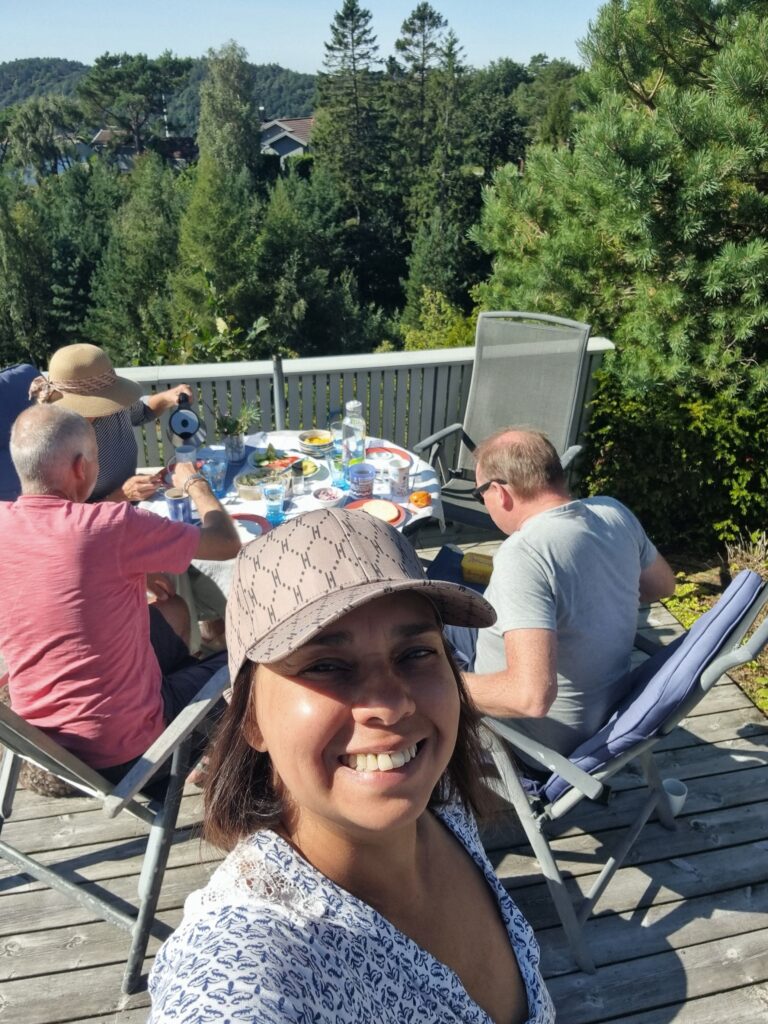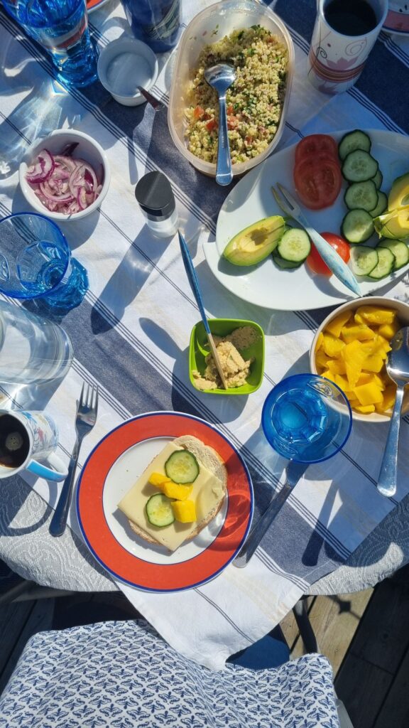 Vi nyter en deilig frokost på søndagen, ute, i steikende sol.